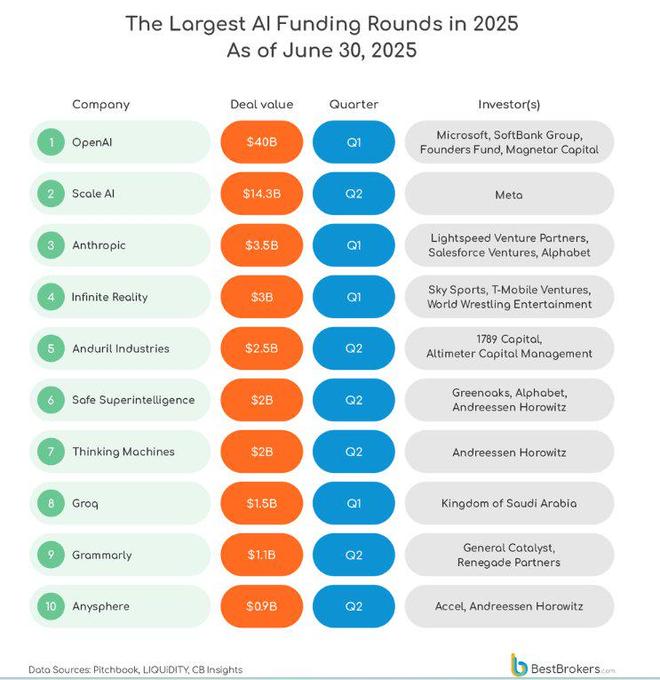 自今年年初以来,中东申请的财务已提高了1,220亿美元的惊人风险资本公司,根据市场最佳经纪人市场最佳经纪人的最新数据,美国市场的谈判数量达到了103亿美元,占今年总资金的85.5%。 “为人工智能争夺的斗争可以继续热身,” BestBrokers.com的财务专家兼编辑保罗·霍夫曼(Paul Hoffman)在一份新的研究报告中说。 Dealroom统计数据是一家专注于这家初创公司的数据供应商,在2024年收取了约1,100亿美元的收入。相比之下,2025年,一场空前的战争激发了2025年,反对燃烧全球人工智能货币的战争,以及诸如OpenI和人类等新公司的融资量表超过了上一年。 Best Brokers汇编的投资趋势表明,第二季度新的Globa Companiesthey筹集了500亿美元,这几乎占风险资本公司总投资的一半(VC)在同一时期。上图显示了自2025年以来最大的开始融资回合。关于这种前所未有的投资繁荣,相对谨慎的数据是,最佳经纪人的分析表明,与新AI公司有关的总投资总数从上个季度略有下降至5000亿美元,而不是过去几年。 AI指导的风险资本景观:“新成立的超企业实验室目标的风险资本大小,以及少数规模的员工加入了目标。其他值得注意的公司包括Andrill Round的25亿美元,由彼得·蒂尔(Peter Tiel)基金会的高级基金(Peter Tiel)指挥,以14.5亿美元的价格为14.5亿美元,以增加14.5亿美元的价格。50.5亿美元。 Alphabet的Google和Reessen Horowitz筹集了20亿美元的资金。实施与IA相关的许多投资计划的公共部门和私营部门。霍夫曼说:“我们所看到的不是上一年呈现的风险资本利益的崩溃,而是随着人工智能基础设施的长期建设和AI的高级应用,AI投资的超浪潮。”这种趋势得到了美国总统唐纳德·特朗普(Donald Trump)承诺的AI和能源系统的920亿美元投资套餐的支持,并有望在这两个关键领域带来更大的投资。但是,由于美联储保持高长期利率和美国在长期历史最高途径中保持美国的表现,因此整个风险投资市场继续面临挑战。在2025年的第二季度,总风险资本投资仅降至10015亿美元,略低于其第一季度的128.4亿美元。 “减速的另一个重要因素是OPI的连续干旱。霍夫曼说:“市场出口以及风险资本机构筹集新资金资金的能力也有限。”霍夫曼说。诸如Databricks Andopenai之类的主要新AI公司选择继续保持维持,信任融资和积极支持二级市场的延误和积极的支持。二级市场的最佳经纪人研究表明,最佳的技术集中在最重要的公司中,涵盖了最重要的公司,包括新的202.在World in 205,这是205.这是205.这是25.这是25.这是该公司的205.这是25.这是该公司的205. ins the World in 202。 OpenAI,人类,规模AI和Infinsy Reality在2019年获得了数十亿美元的资金收集。融资可能是最安全的选择,而不是专注于潜在的高风险返回公司,而不是专注于美国的“大规模”级别的“大规模”群体,而不是专注于美国的库存期权。ER Global,红杉和Lightspeed Venture Partners继续以数十万美元的投资组合的投资组合为全球全球全球全景的全景。人工智能智能。他在接受媒体采访时说,Openai将在“狭窄的未来”中投入数万亿美元,利用最重要的AI基础设施来使用AI芯片,数据中心的高性能网络设备,高级能源系统和其他AI培训,包括对AI/a I/ai/erse AI的运营运营运营运营运营运营运营运营运营运营运营运营运营运营运营运营运营运营运营运营运营运营运营运营运营运营运营运营运营运营的他的高性能网络。操作操作操作操作操作操作操作操作操作操作操作的操作操作的运营操作操作操作操作操作操作操作操作操作操作操作操作操作运作运营操作操作运作运营操作的运作运营操作操作运营运营操作运营运营的运营操作运营运营运营运营运营运营运营的运作是,社会整体上是不可能)摩根士丹利,这个病情将此参考指数的市场价值增加30%。它的意义。自4月8日至少年度以来,美国股市的参考指数。 uu。标准普尔500指数的投篮命中率为25%,历史上仍然最高。大部分增长来自AI的流行病驱动。 AI Boom领导了两个技术巨头NVDA.US和Microsoft(MSFT.US),达到了创纪录的市值40亿美元。此外,标准普尔500指数的可靠公司利润支持了特朗普混乱的商业政策并未在市场上造成预期绩效的乐观情绪。该机构的策略师在他的最新报告中写道,没有特定的预测时间表,假设AI的能力继续“迅速辐射”,并且公司将采用AI广泛采用。年复一年,这可能会增加大约9200亿美元的净利润,主要是因为它有助于大量裁员,节省成本和新的收入产生。摩根士丹利战略家的预后数据表明,AI代理商(代理商Afoevisión,通用AI)的净收益价值可贡献约4900亿美元。从当前的技术轨迹来看,IA应用程序软件开发局重点介绍了“一般AI应用程序软件”(例如,Claude,DeepSeek,Chatgpt,Sora和AI应用程序软件),并且基于AI的生成特征,AI的特征已迁移到CATC和Cumbersome和Cumbersome和Envisados。公司迫切需要提高效率并降低运营成本。在不久的将来,他们付出了巨大的努力,以在AI应用程序软件的两个中心类别中推广广泛的应用程序:生成AI应用程序和AI代理。其中,AI代理更有可能在2010年之前,AI代理的出现是THES应用I的一般趋势,AI代理是非常聪明的Productiv人工智能是信息支持工具的非常聪明的生产工具。这意味着它已经开始发展。